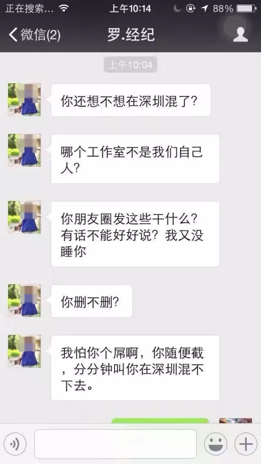 第18天:經濟人發微信威脅自己,不從,截圖發朋友圈控訴他。