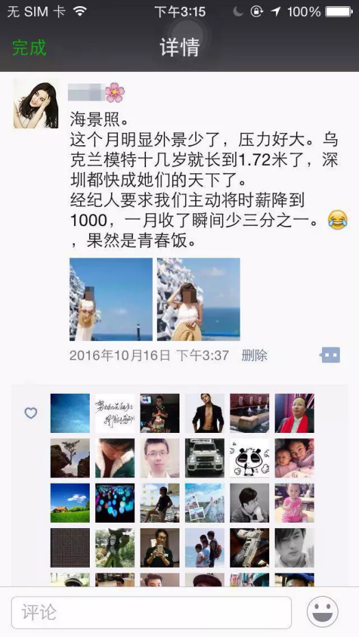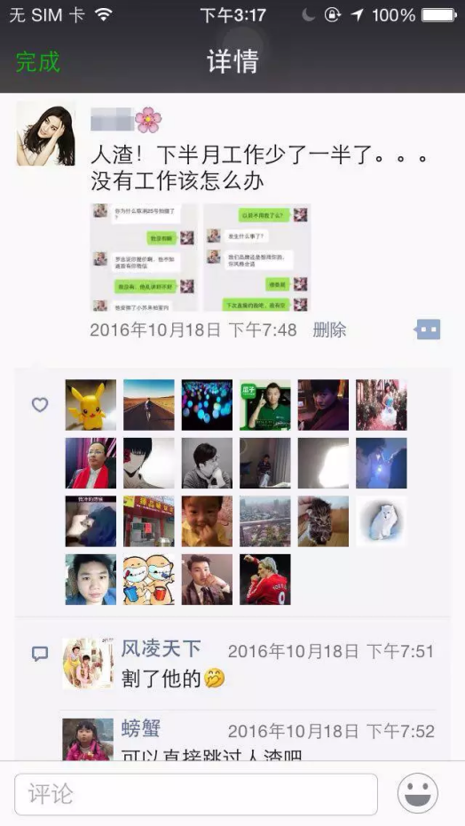 2、20天后,劇情轉折,發圈表示經濟人欲潛規則自己,現已走投無路。此時,一定會激起粉絲的憤怒、同情與共鳴??勺孕邪缪萁浖o人,制作如下截圖,使得事件真實可信。點擊即可顯示完整高清大圖。